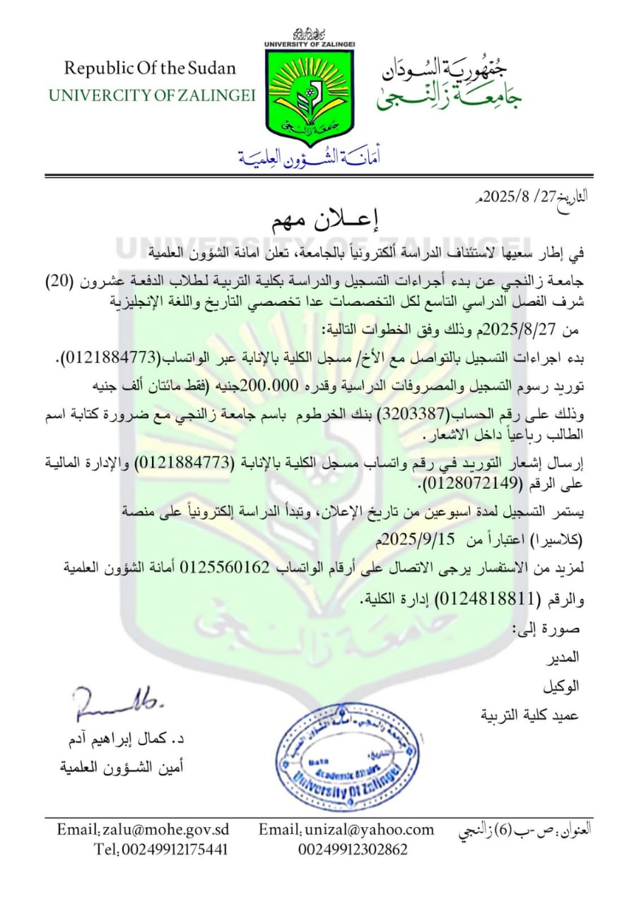 بسم الله الرحمن الرحيم جامعة زالنجي ادارة العلاقات العامة والاعلام الموضوع : عطلة عيد الاضحي المبارك استنادا علي قرار مجلس الوزراء رقم 161 للعام 2019م بشان العطلات والمناسبات الدينية والقومية لسنة 2020م , نفيدكم بان عطلة عيد الأضحي المبارك سوف تبدا من يوم الاحد الموافق م18/7/2021 وحتي الخميس الموافق م22/7/2021...