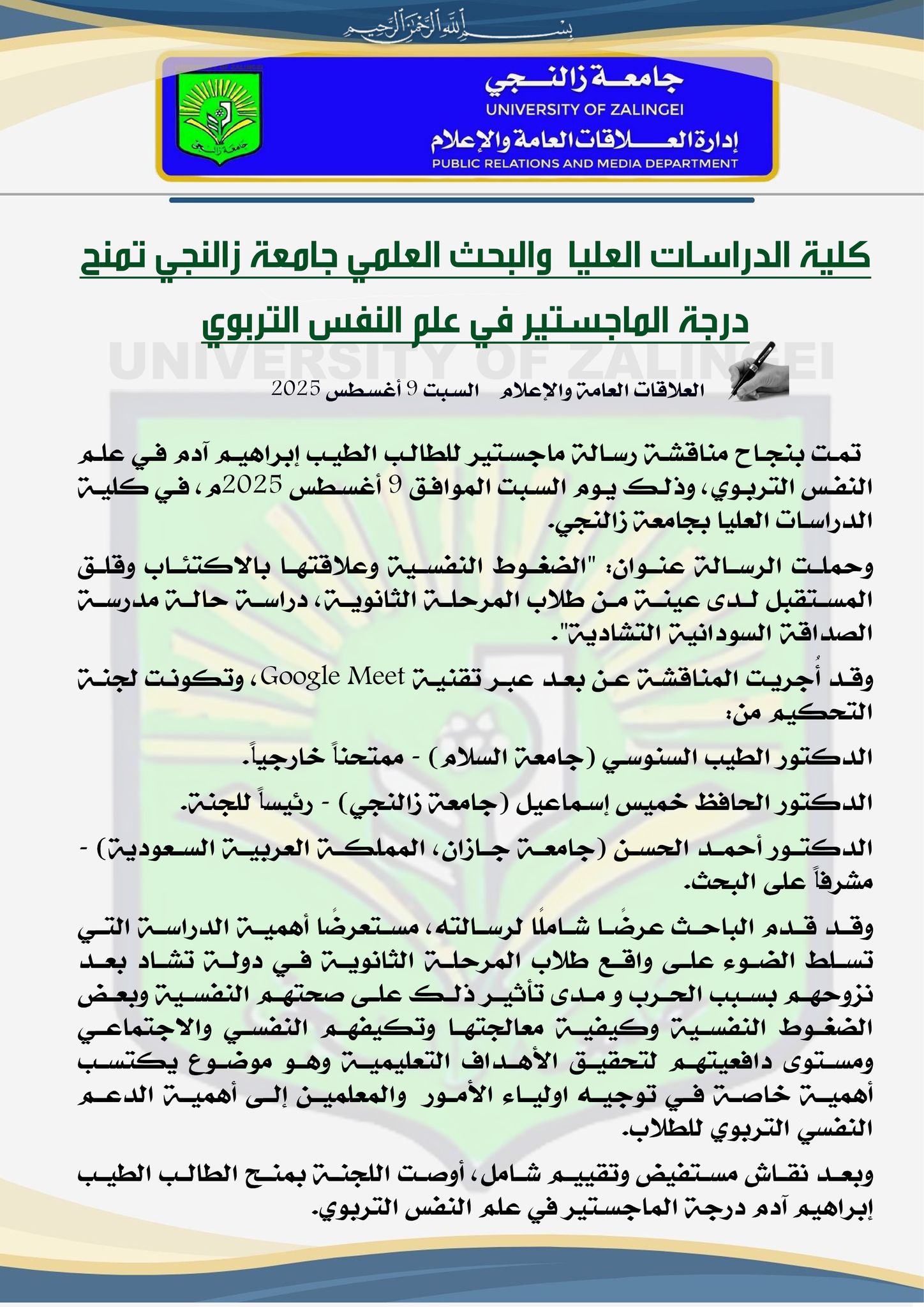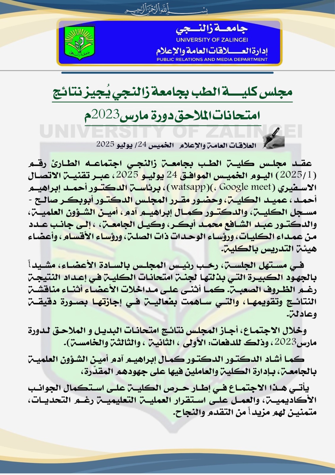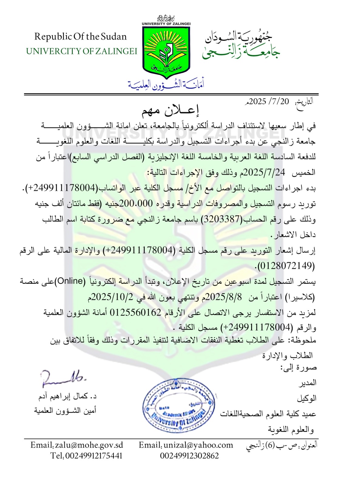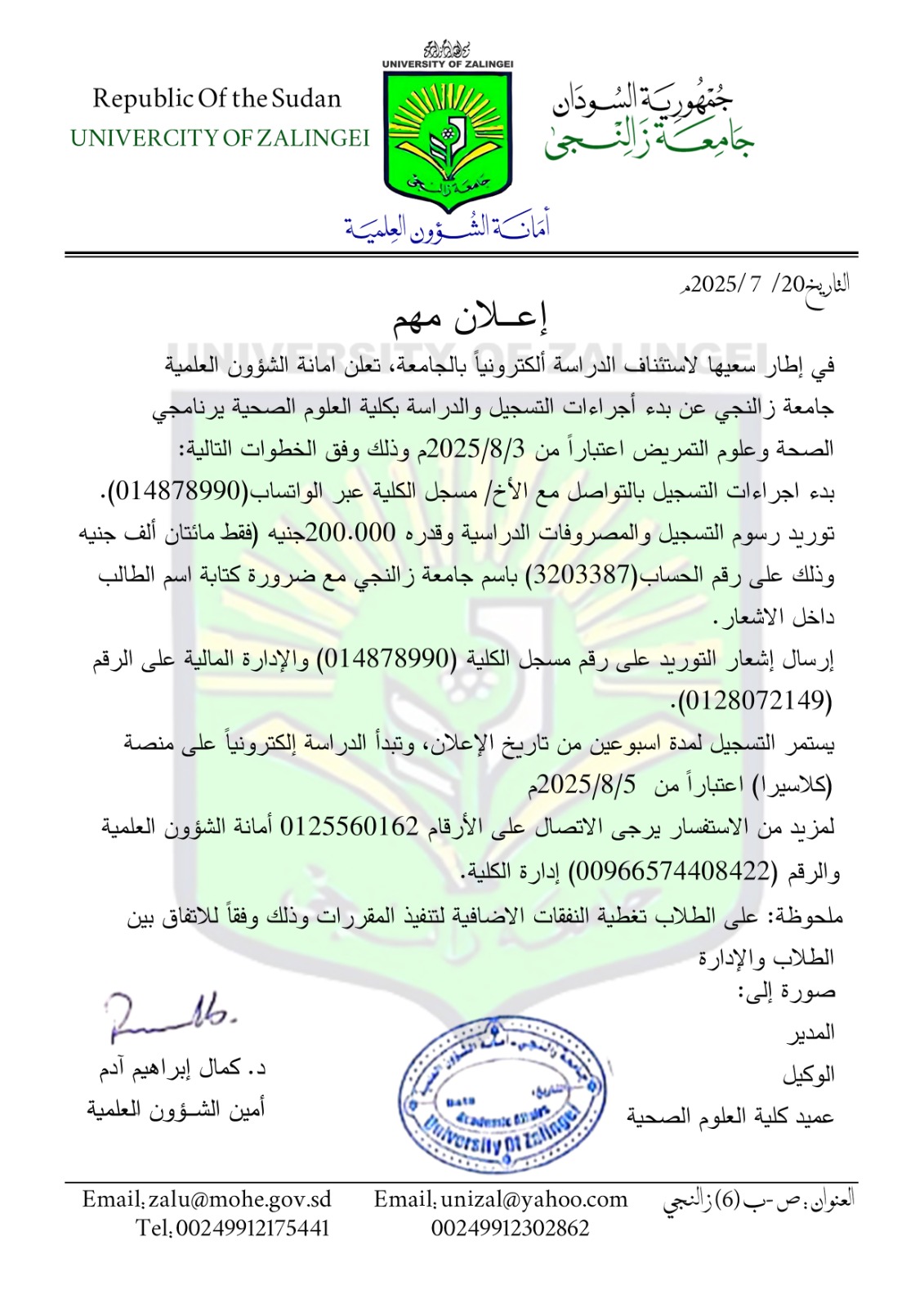 بسم الله الرحمن الرحيم جامعة زالنجي ادارة العلاقات العامة والاعلام الموضوع : عطلة عيد الاضحي المبارك استنادا علي قرار مجلس الوزراء رقم 161 للعام 2019م بشان العطلات والمناسبات الدينية والقومية لسنة 2020م , نفيدكم بان عطلة عيد الأضحي المبارك سوف تبدا من يوم الاحد الموافق م18/7/2021 وحتي الخميس الموافق م22/7/2021...